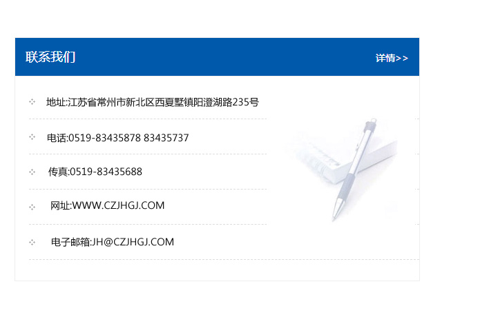 地址:常州市新北區友邦商務大廈1幢16、17層  電話:0519-85101652  傳真:0519-85112595  郵編:213022  網址:www_cz-jiayue_cn.kaidaxin.com  郵箱:xiajifengaa@163.com